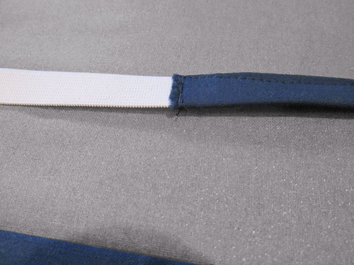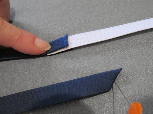 - Insert the elastic into the open raw end of each tie to create one continuous length: tie/elastic/tie. Pin in place.