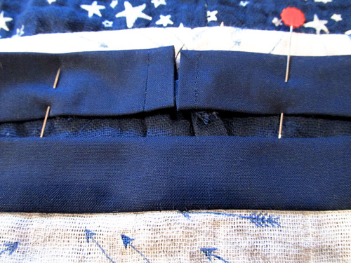 - Place the waistband casing right sides together around the top opening. The raw edge of the casing should be flush with the top raw edges of the skirt layers. The folded ends of the casing should come together over the side seam. These ends will come quite close but will not meet. Pin in place through all three layers.