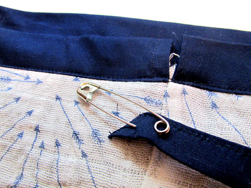 - Place a pin at this point to secure what is the center point of the elastic inside the casing. Thread a hand sewing needle and tack the elastic in place at this point. You could also run a short machine stitch to hold the elastic in place, just make sure your seam is tidy and in matching thread as it will be visible. We preferred the simple hand tack. This tack keeps the tie balanced so you can cinch up the waistband from both sides without accidentally pulling the tie too far through on either end.