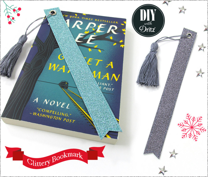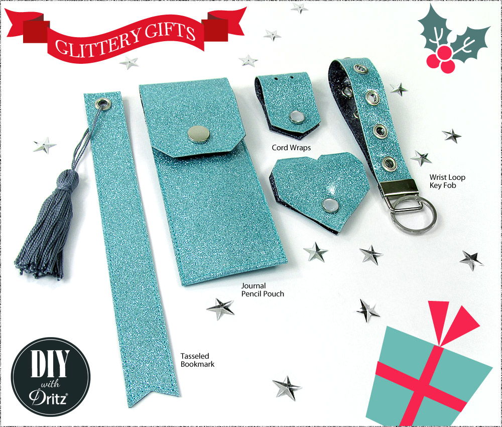 When the holidays begin inching closer and closer… it’s officially the Festival of the Last Minute. We’re right there with you and have put together a set of five nearly-no-sew projects that use Dritz hardware and tools to make the steps easy and the results outstanding. We worked with two layers of craft weight glitter vinyl to fashion a journal pencil pouch, tasseled bookmark, wrist loop key fob, and two sizes of cord wraps. As we put together the set, we’ve been referring to them in-house as: Sparkly Things… and really, that’s exactly what they are. Truth be told, we can all use a bit more sparkle in our lives – dontcha think?!