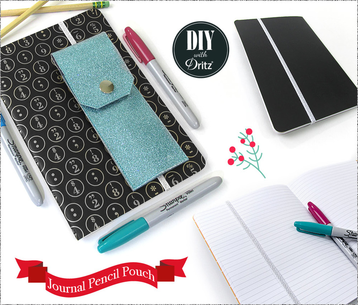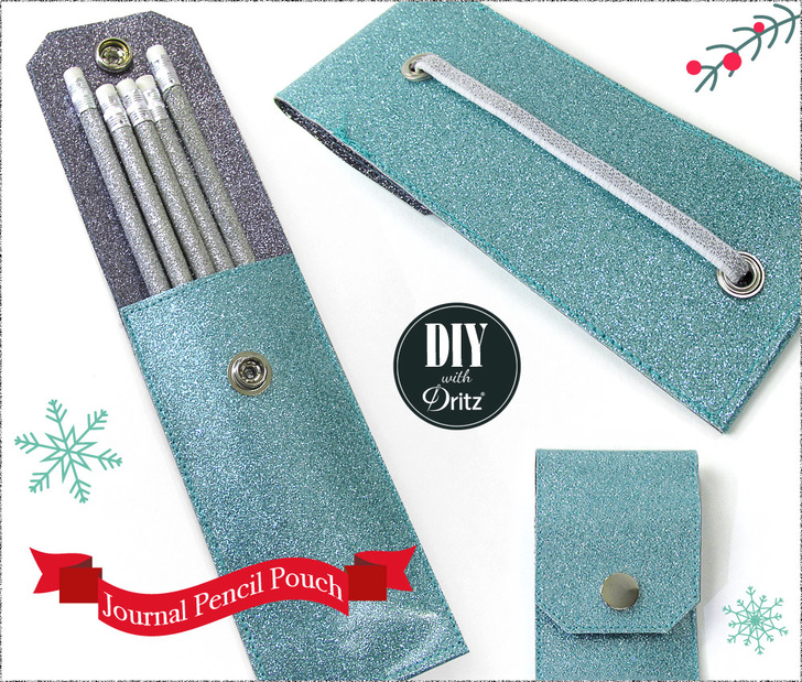 Our Journal Pencil Pouch, is meant to slip over a notebook to hold writing tools as well as to hold your place within the journal. The sparkly Dritz Metallic Elastic loop at the back is fed through two Dritz ¼” 2-Part Eyelets and stretches to fit booklets from 5½” to 8½” tall. The front flap snaps in place with a Dritz Heavy Duty Snap.