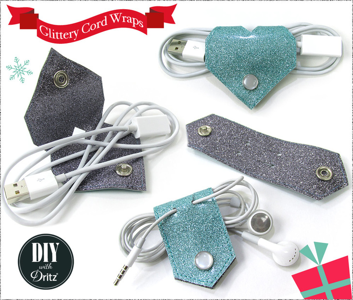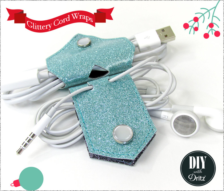 We designed two Cord Wrap shapes to hold small items like ear buds or slightly larger items like USB cords. The smaller angled wrap has two top slits that can help hold the end of the cord so it’s easy to find. A mini hole punch and X-Acto knife are the best ways to get a clean cut. Both wraps feature a pretty Dritz 12mm Pearl Snap to hold them closed.
