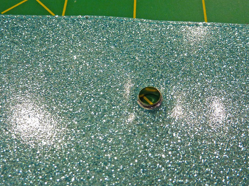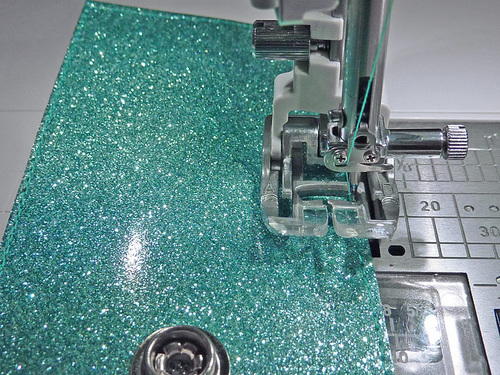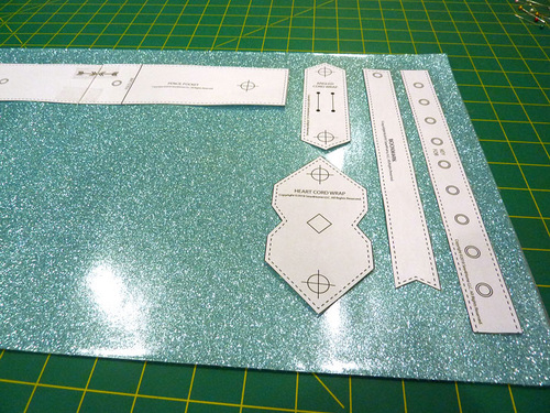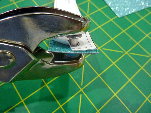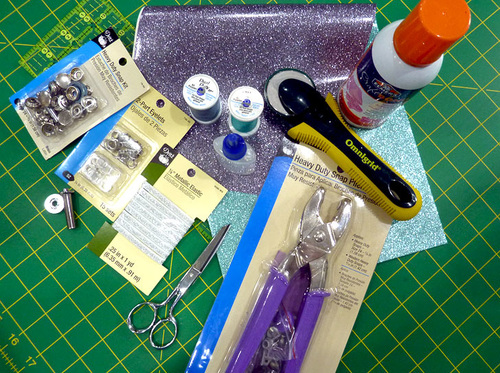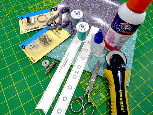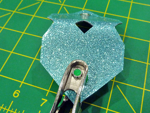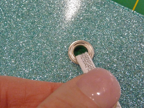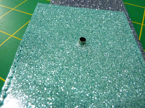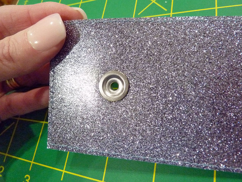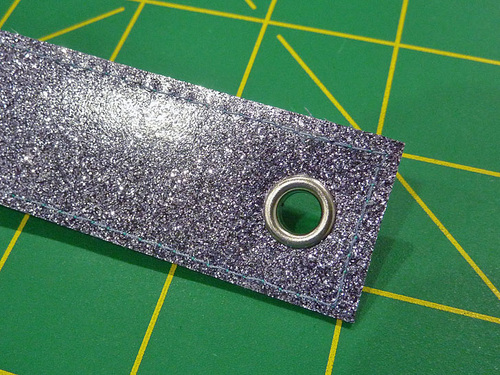 - With the main panel cut, edgestitched, and sealed, the other steps are the eyelet and the tassel. The Dritz 2-Part Eyelet is inserted in the same manner as above. The glitter vinyl is hard to mark on; as a slick surface, most marks just want to rub off. It’s easiest to leave the paper template in place for the insertion.