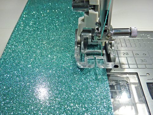 - Thread the machine with different color thread in the top and bobbin to best match your vinyl layers. You can edgestitch with either side facing up.
