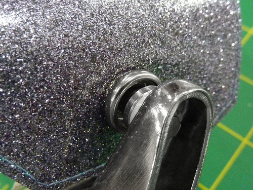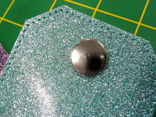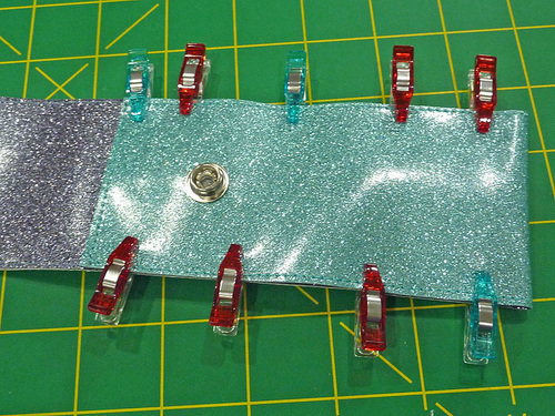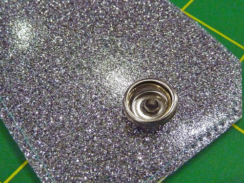 NOTE: Remember that on our Sparkly Things, we consider the Aqua Glitter Vinyl to be the front and the Steel Glitter Vinyl to be the back. - Using the Dritz Snap Pliers, set the snap half.