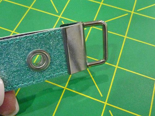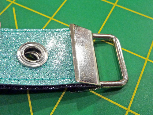 - With the main panel cut, edgestitched, and sealed, the other steps are inserting the nine eyelets and attaching the key fob.