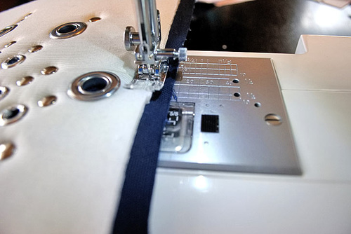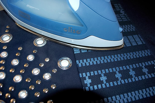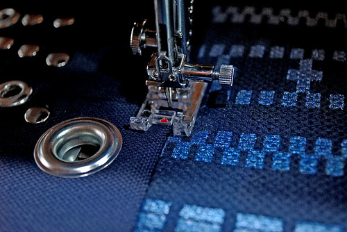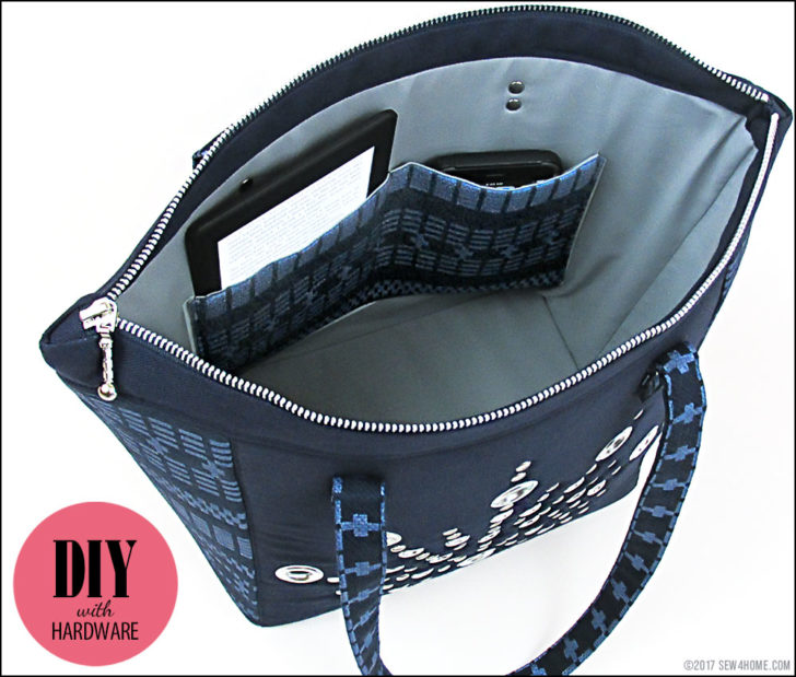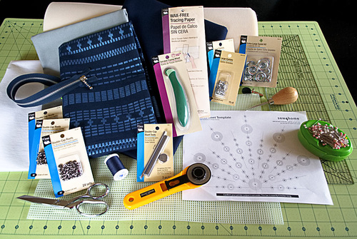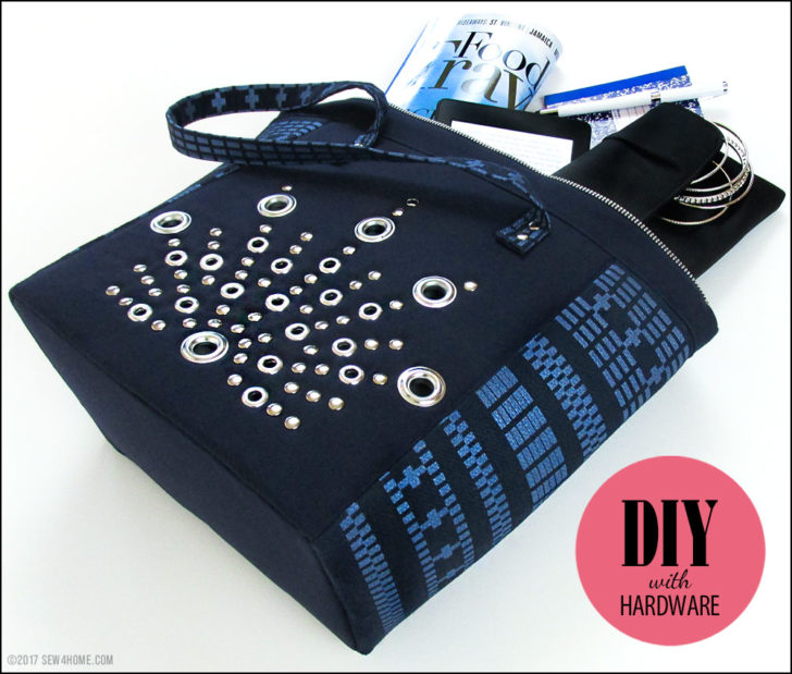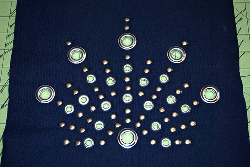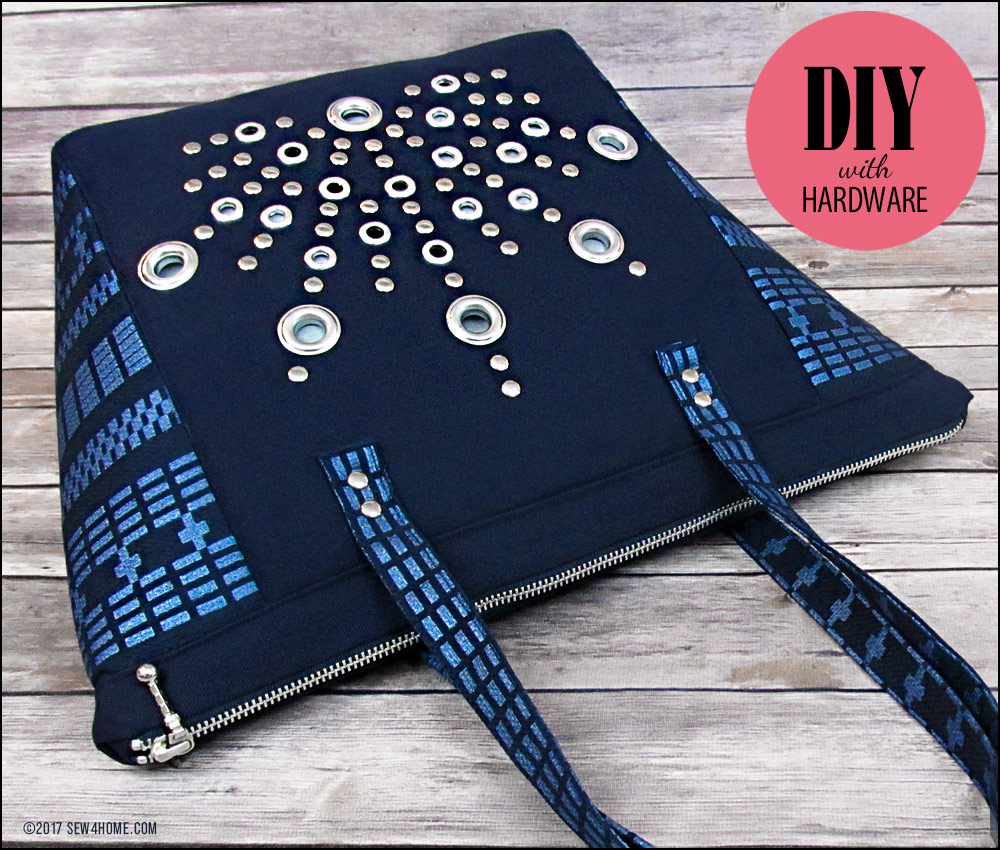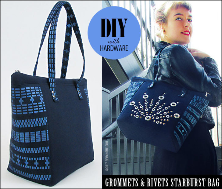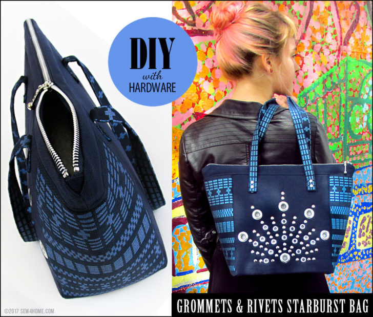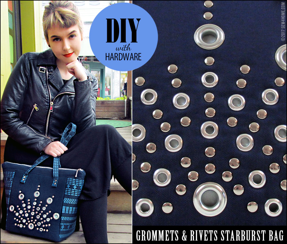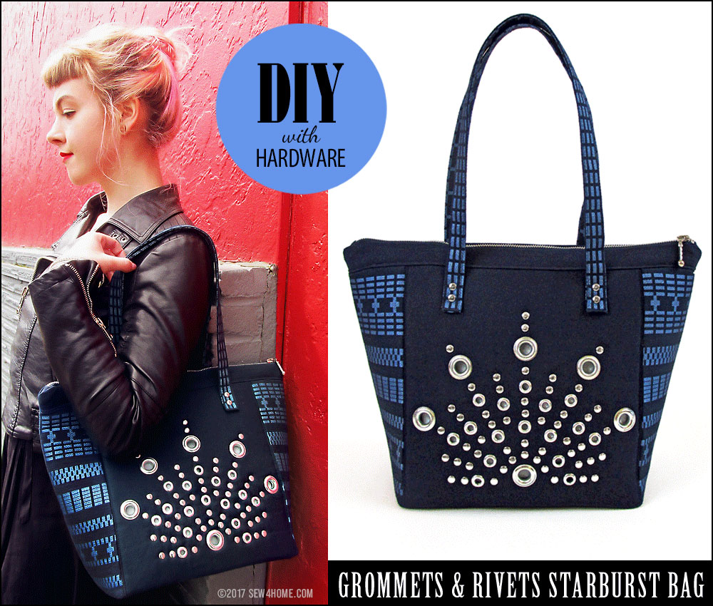 Hardware is usually categorized on the functional side of sewing. It adds a professional finish and allows your project to snap, lock, clip, slip, buckle, and more. For this project, we moved hardware into the fashionable category, applying grommets (large and extra large eyelets actually) and rivets to create a striking starburst design on the front of a bag. You get dimension and texture, plus the openings cut by the grommets allow a second color to peek through from the bag’s lining.