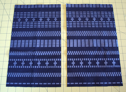 - Place the fused panel right sides together with the lining panel. Pin around all four sides, leaving an approximate 3” opening along the bottom edge.
