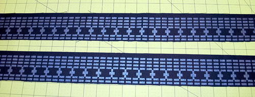 - Find two of the 17” strips. Center one strip along one side of the zipper. The end tabs will extend a bit beyond either end of the strip. This is correct, concentrate on centering the strip on the zipper.