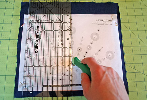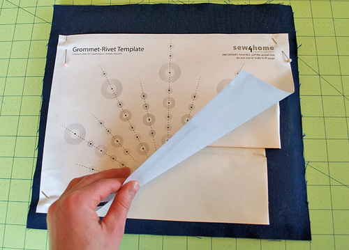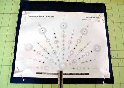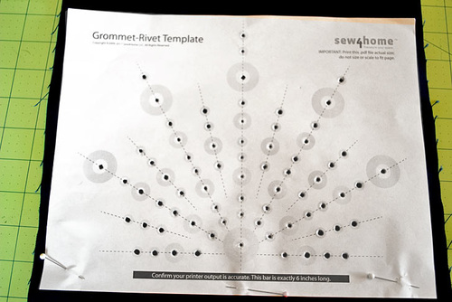 NOTE: As mentioned above, this type of hardware is easy to use, but we always recommend practicing in order to confirm the proper hole size to cut as well as the force needed (or not needed) to set each rivet and eyelet. - Place the exterior center panel right side up and flat on your work surface. Place a printed template over the panel. The template should be centered side to side and the bottom edge of the bottom center eyelet should be 1½” up from the bottom raw edge of the panel. Pin at each corner.