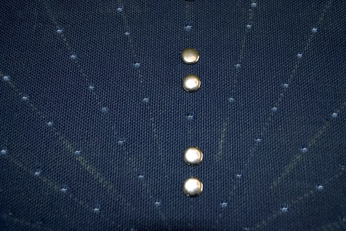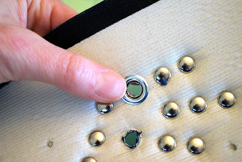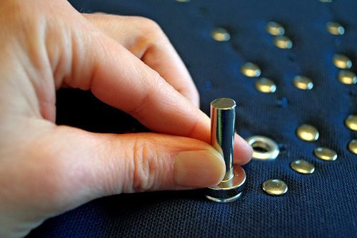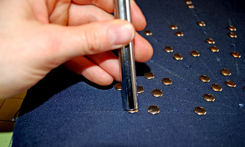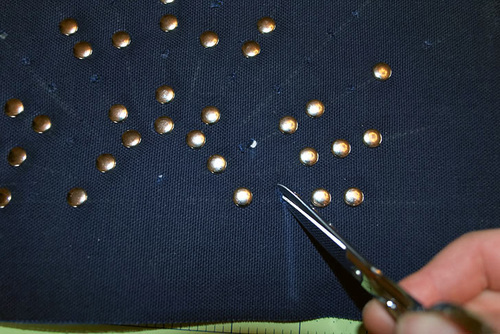 - … through to the back. Set the bottom half of the rivet in position. The Dritz Double Cap Rivets are cool because the back half simply snaps into position so it doesn’t shift around.