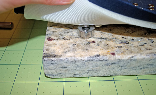 There is a detailed template to download below for our custom starburst design. Using the marking tools we recommend (Dritz Wax Free Tracing Paper and a Serrated Tracing Wheel) makes it easy to give yourself precise guidelines to follow. Prior to starting, do a few tests on scraps of your actual fabric and foam. This type of hardware is actually quite easy to use, but practicing your technique allows you to confirm the proper hole size to cut as well as the force needed (or not needed) to set each rivet and grommet. It is particularly important to give yourself a solid base on which to work. You’ll see in our steps below that we used a small granite block. You could also use a metal block or hard wooden surface. Whichever you choose, don’t skip this recommendation. To properly set hardware, you can’t use a soft surface and expect proper results.