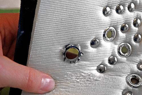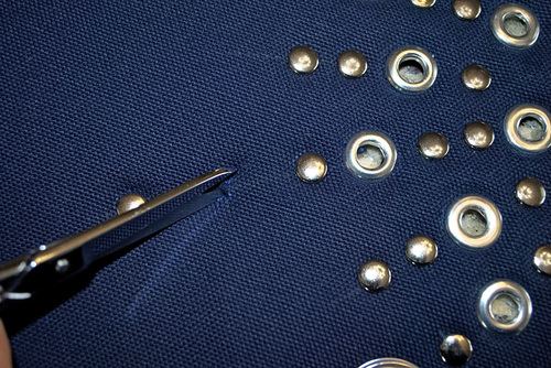 NOTE: Unlike the rivets, the back half of the eyelet/grommet does not stay quite as securely in place. So, it’s better to hammer together the eye/et/grommets one at a time. - Finally, move to the final six Extra Large Eyelets. Again, cut open the initial holes a bit with small, sharp scissors.