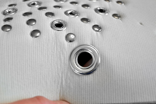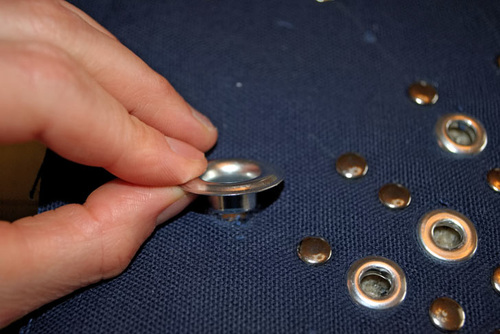 - Insert the eyelet top through the hole. As with the rivets, insert each of the top halves from front to back. There are 16 Dritz Large Eyelets. Place a back ring in position over the top half.