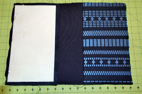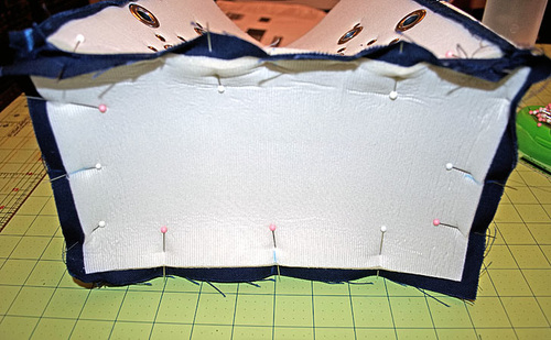 Fusible foam gives the bag its exterior structure. We also added a bottom stabilization panel: a sheet of plastic canvas inside a removable sleeve. Not only does this provide additional support for the bag to sit upright on its own, the base helps smooth the lining flat and taut so it shows nicely through the front grommets.