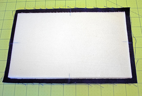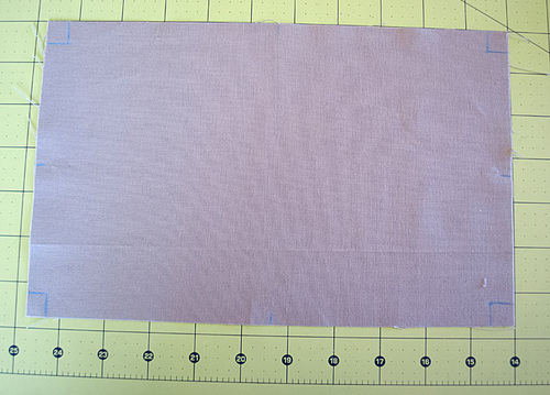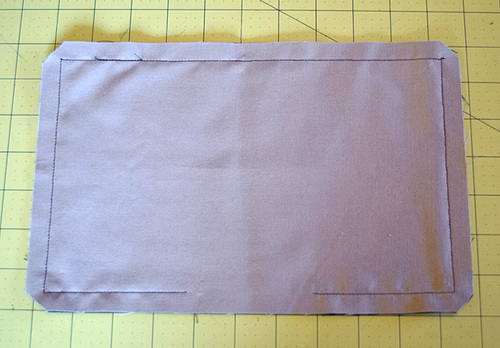 - Find the lining base panel. It is inserted in the same manner as the exterior base panel above. However, since there is no interfacing on the lining to use as a corner start/stop guide, draw in a ½” box at each corner.