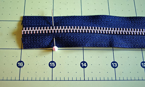 - If your zipper is longer than 16”, as ours was, you’ll need to cut it to size. The entire opening is 16”, but the zipper opening itself should be 15”. Measure from the top of your zipper’s pull down 15” and place a pin. Then measure an additional inch and cut away the excess. There should already be about 1” of zipper tape above the zipper stops at the top. Metal zippers are easier to cut than you might think. Simply cut between the teeth — but don’t use your good scissors!