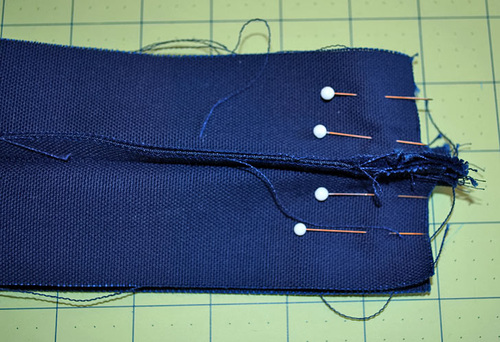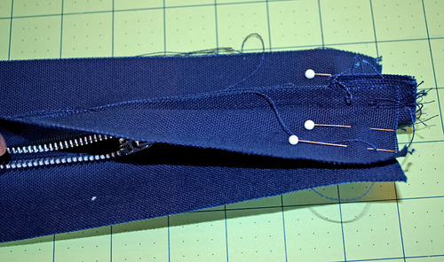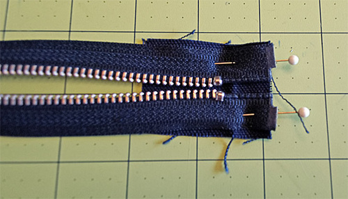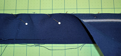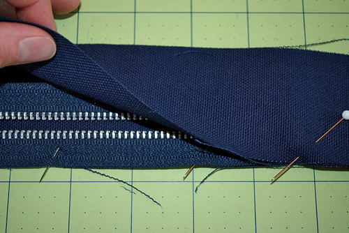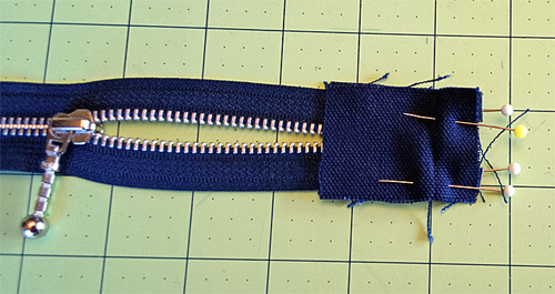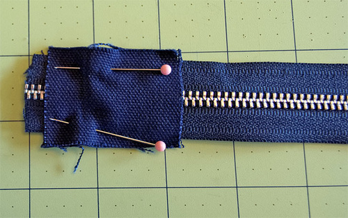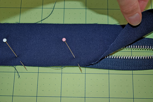 - Place one tab underneath the zipper at the top end, aligning the crease line right above the top zipper stops. Pin in place.