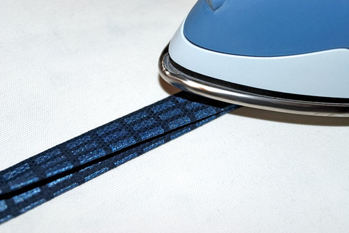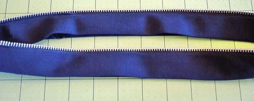 NOTE: All with all zipper insertions, when you feel you are approaching the zipper pull, stop with your needle in the down position. Raise the presser foot and twist the layers slightly so you can access the pull and move it out of the way of the presser foot. Once clear, drop the presser foot, re-position the layers, and finish the seam. - Press both strips away from the zipper teeth so the strips are now wrong sides together.