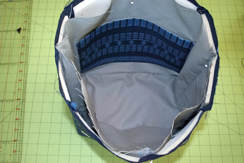 - Push the lining all the way down and align the two base panels. Then, adjust the side seams of the lining as needed so they are at the center of the exterior side panels. When the lining is sitting straight inside the exterior, pin in place around the top.
