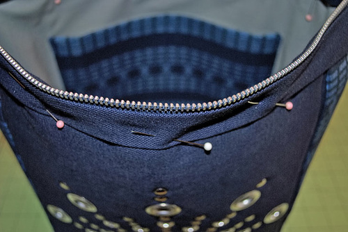 - Find the zipper unit. Pull apart the layers and slip the unit over the top of the bag. One strip should be against the front of the exterior, the other strip should be against the lining. Pin in place.