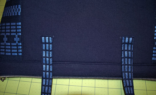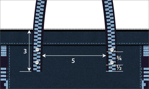 - The bottom of the handles are 3” down from the finished zipper opening and the handles are spaced 5” apart – to 2½” to either side of the center of the main panel.