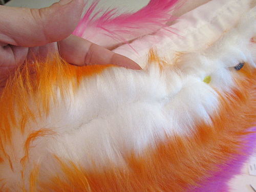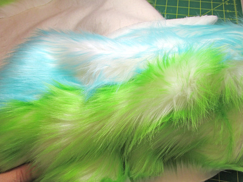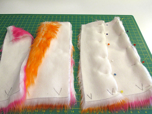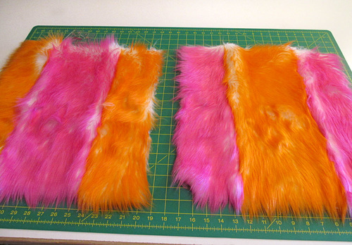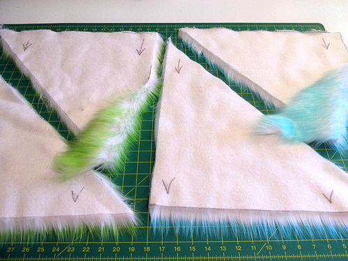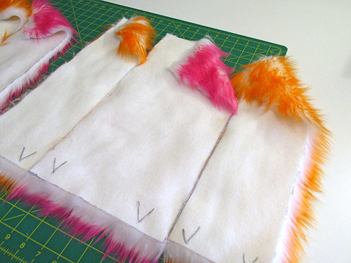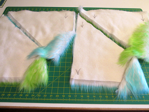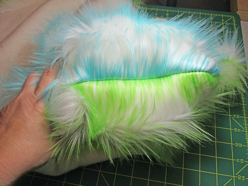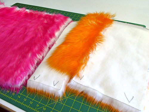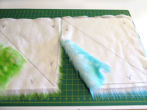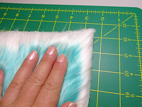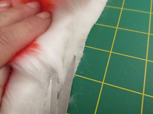 - Before matching up the front and back, trim back some of the nap at the corner points where the two colors combine. There a lot of fur happening at those corners and you need to grade back the bulk in order to not only precisely align the panels, but also to give you a cleaner corner. Any trimming will, of course, be hidden on the inside.