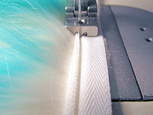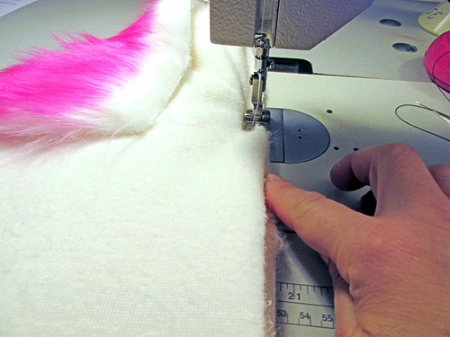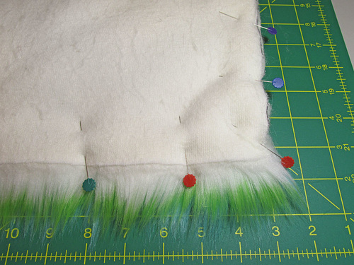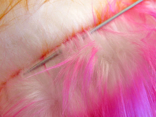 - When pinning faux fur, push the nap in and away from the raw edges. By tucking the fur to the inside as you go, you are less likely to catch up the hairs in the seam.