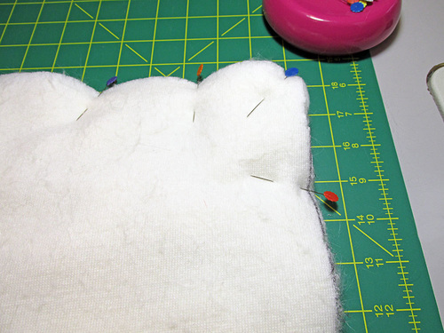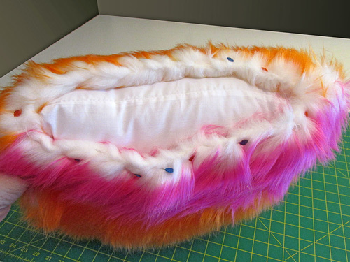 - Place the front and back panels right sides together, matching up the narrow panels and making sure the nap is all flowing in the same direction. Pin all around. As above, remember to push the nap of the faux fur in and away as you pin. Leave an approximate 10” opening along one side for turning.