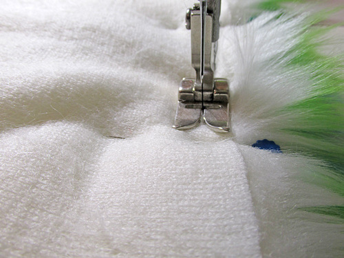 - Repeat to attach the remaining pom to the opposite side. On this second pom, you can drive the needle right through the center of the pom and then back through again. The nap covers all the stitching.