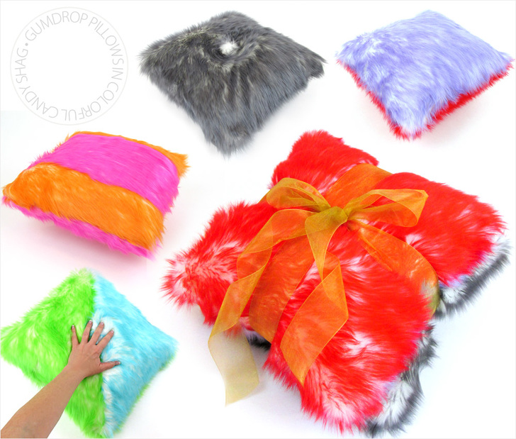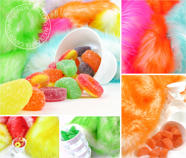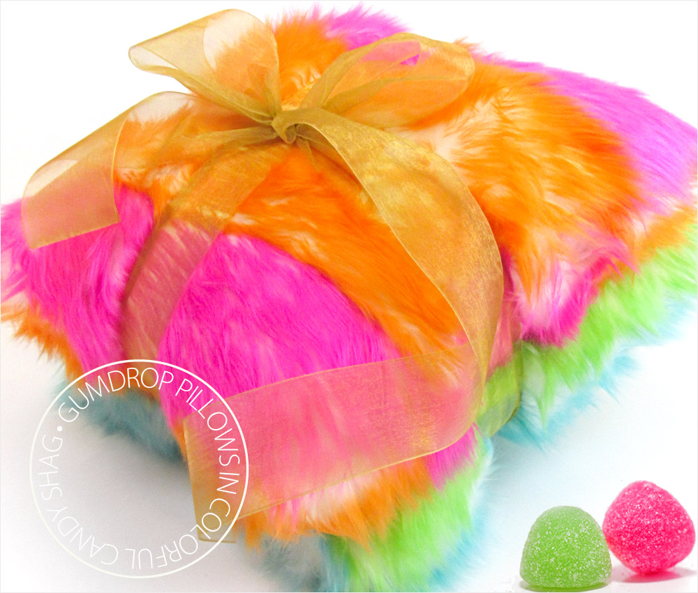 When the weather is dreary, the world outside seems to be nothing but varying shades of gloom. That is the very best time for a color infusion! Our eye popping Gumdrop Pillows are created in multiple colors of a shaggy faux fur. The luxuriously long nap starts as pure white at the base, finishing with brilliant candy colors at the tips. As the nap shifts, so does the color, flashing from white to bright and back again. If I had the guts, I think I’d try this technique on my own hair.