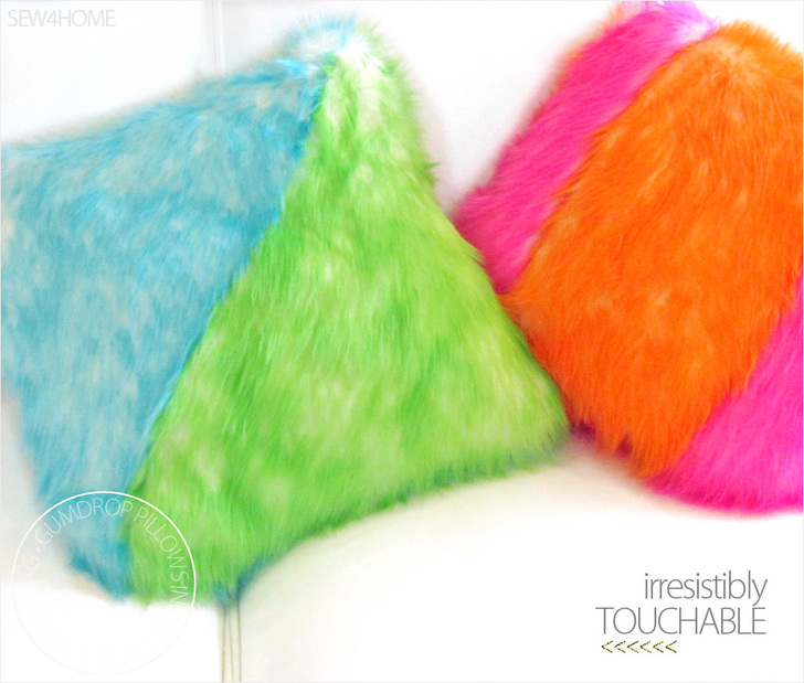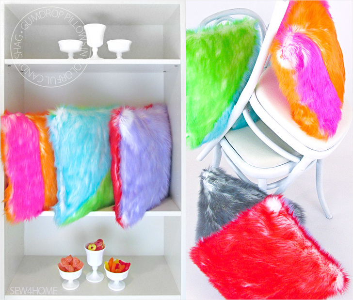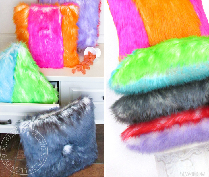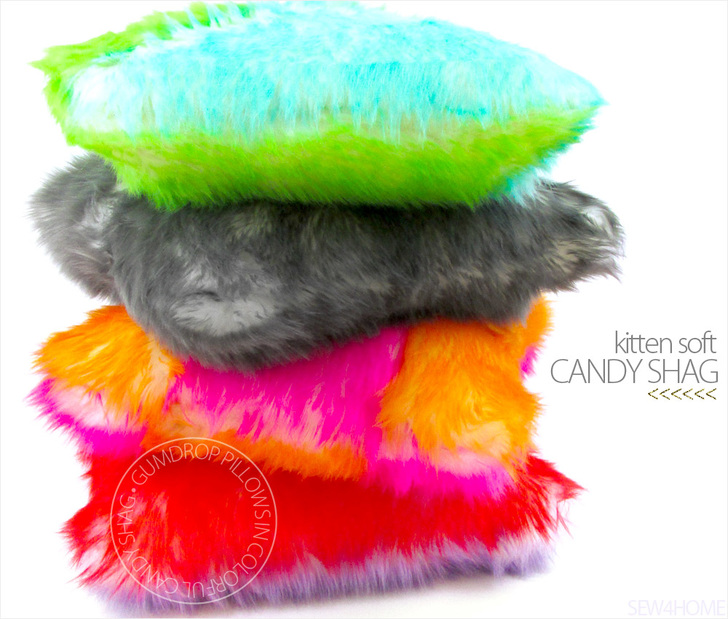 We spotted this candy colored faux fur in as many as 17 different playful hues of candy shop gumdrops. We selected seven different colors to mix and match into our set of four 16” x 16” pillows. As with most faux fur and fleece, this shag comes in a very wide width: 58/60″. Working with just half yard cuts of each of your chosen colors, you could make enough to open up your own Gumdrop Pillow Shop.