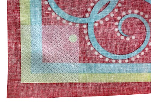 - Following manufacturer’s direction, fuse one square to opposite corners on one 20″ x 20″ square of fabric. Either square is fine; in my sample, I put the fusible on the red square.