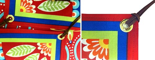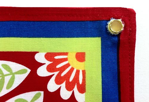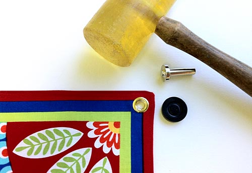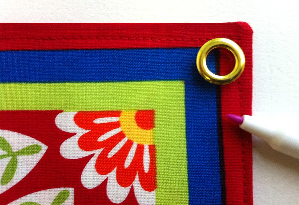 - Insert a grommet into each reinforced corner (the corners with the fusible interfacing). The directions that come with the grommet set are actually quite clear… for package directions! To summarize, first use the grommet top to determine placement, then trace around the inner circle to mark that placement.