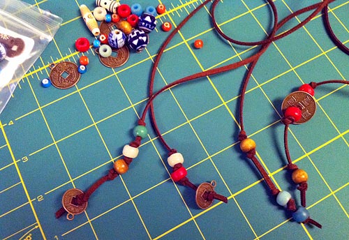 - String a variety of beads and baubles on to all four ends of the ties. Knot the thong/cording between each piece to hold it securely in place.