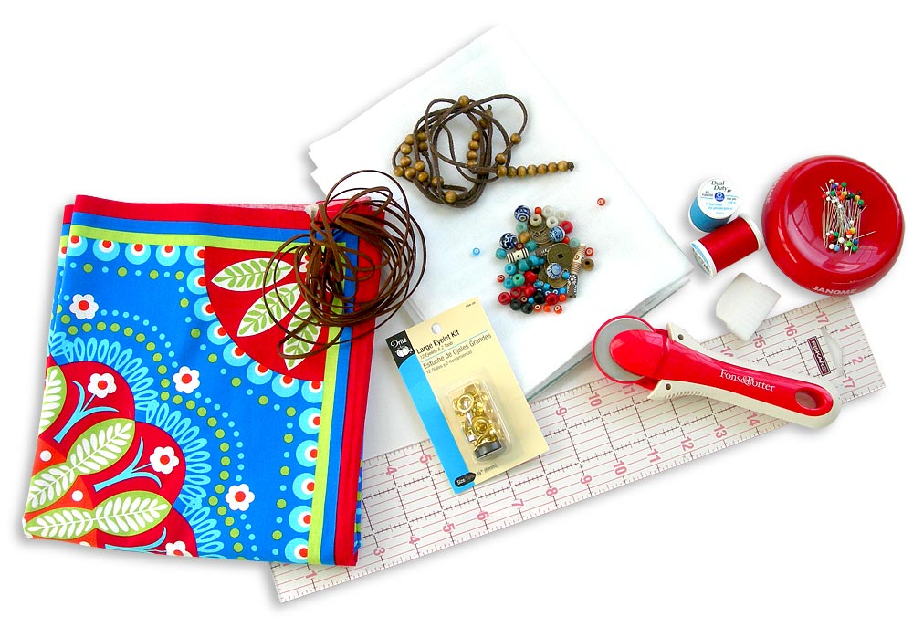 NOTE: If you use the same Gypsy Bandana fabric as we did, with its pre-printed bandana shapes, you can get away with 1 yard. If you decide on another fabric, you should get ¾ yard each of two coordinating prints – with careful fussy cutting, you should be able to make two scarfs from this amount of fabric. - 4 yards of suede thong or soft cotton cording: we used suede thong in a russet brown