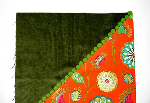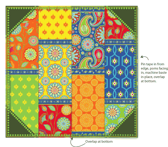 - Using a zipper foot, machine baste the pom pom tape in place around all four sides.
