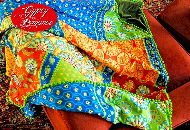 Today begins our Gypsy Romance Series: seven bright, bohemian projects created from Pillow & Maxfield’s wonderful Gypsy Bandana fabric collection. We swirl out of the gates wrapped in a lush patchwork throw with pom pom embellishments and velvet accents. The generous 56″ x 56″ square features nine different fabrics arranged in an explosion of intoxicating color and pattern. Those horizontal strips are actually topstitched in place over the panel seams… so don’t be scared off thinking you’ll have to do teeny, accurate piecing. In signature S4H style, we make it easy to create a dynamic finished product.