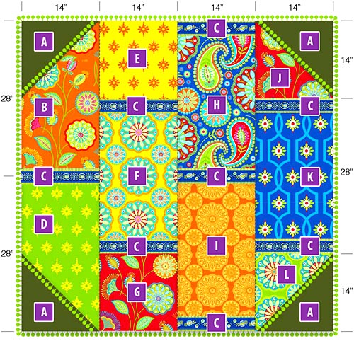 Refer to the layout diagrams below for cutting units. Note that our amounts are generous and allow for fussy cutting. Also, the cuts are sized specifically for the Gypsy Bandana fabric, so the width and height decisions shown are based on best use of the design not necessarily the most economical use of the fabric. If unsure or wishing to conserve, carefully look through the cutting instructions to judge how much of whichever fabric you choose may indeed be required.