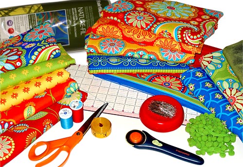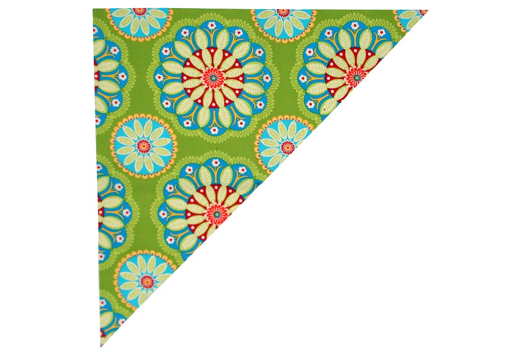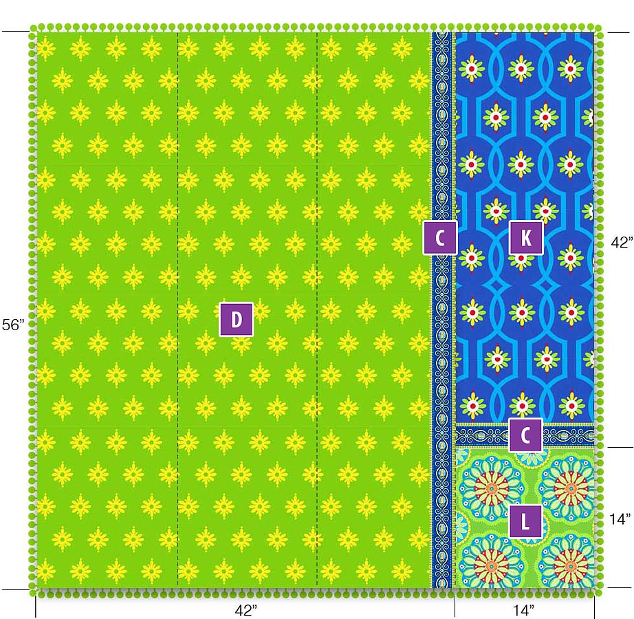 - Fabric for front L piece and back L piece: ½ yard of 44-45″ wide fabric; we used Gypsy Bandana in Kiwi Kaleidoscope by Pillow & Maxfield for Michael Miller Fabrics