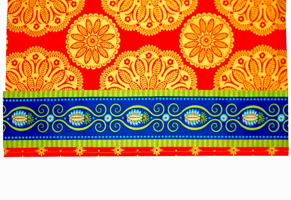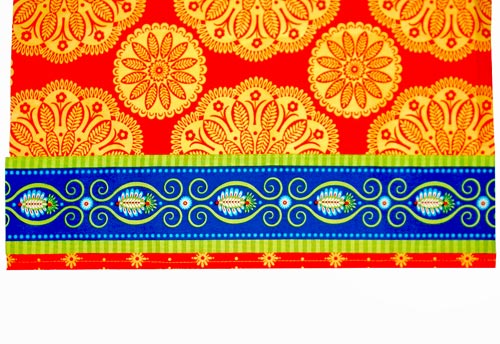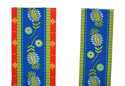 - Cut NINE 15″ x 4″ strips and ONE 57″ x 4″ strip. These are the ribbon accents that cover the seams on both the front and back of the throw. Because our Gypsy Bandana had a perfect stripe within one of its designs, we chose to cut strips and fashion our own ribbons. You could also use extra-wide ribbon (3″) should you not have a similar motif in the the fabric you choose. If you decide to work with ribbon, you do not have to complete the next folding and pressing steps, which create a folded edge(s).