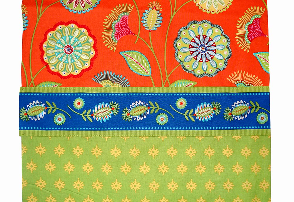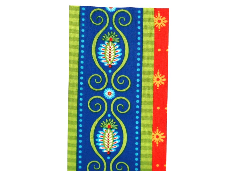 - For the Gypsy Bandana, use the main stripes within the Aqua Gypsy Road (there are two stripe designs; we used both), fussy cut to center the banded section of the print within the 4″ width. This will leave ½” of orange to either side of the green stripes. On SEVEN of the 15″ strips, as well as the 57″ strip, fold and press under this ½” of orange along both long raw edges. These will be your 15″ Double Pressed Bands and your 57″ Band.