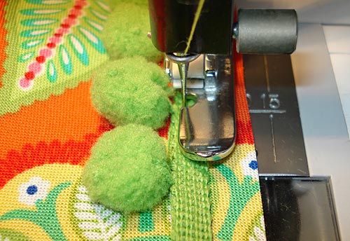 - Using your zipper foot, stitch the pom strip in place. Trim away any excess length of pom pom tape at both ends.