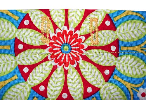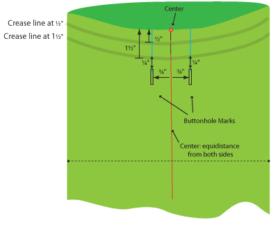 - Following the manual for your sewing machine, make a vertical ½” buttonhole at each of these marks, ¼” down from the second crease.