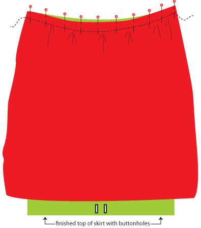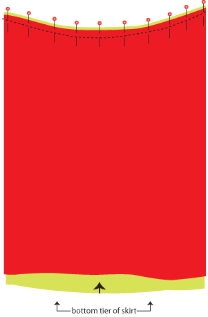 - Slowly loosen the gathering around the Middle/Bottom Ruffle Unit until it is evenly distributed between the side seams at both the front and back of the skirt. Complete pinning the two raw edges together.