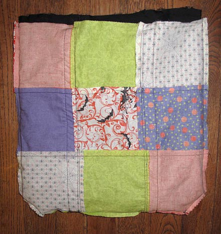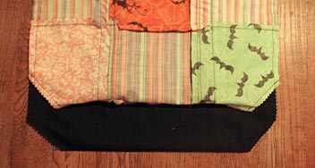 IMPORTANT: To correctly attach the webbing to the patchwork, you must both start and stop your seam lines ½” in from the patchwork’s raw edges – top and bottom. This is necessary because you will be stitching the front patchwork to the lining along these raw edges and so need ½” free for your seam allowance. - Lay the patchwork over the black lining fabric. Trim the black lining fabric rectangle to exactly match the patchwork rectangle. It should trim to approximately 13″ x 25″.