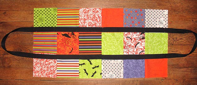 - To place the black webbing for the handles, start with one end positioned three squares down and centered along the seam. Pin in place.