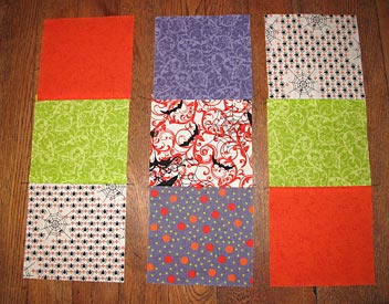 - Sew together, using a ½” seam. Press flat. You now have one completed three-square row.