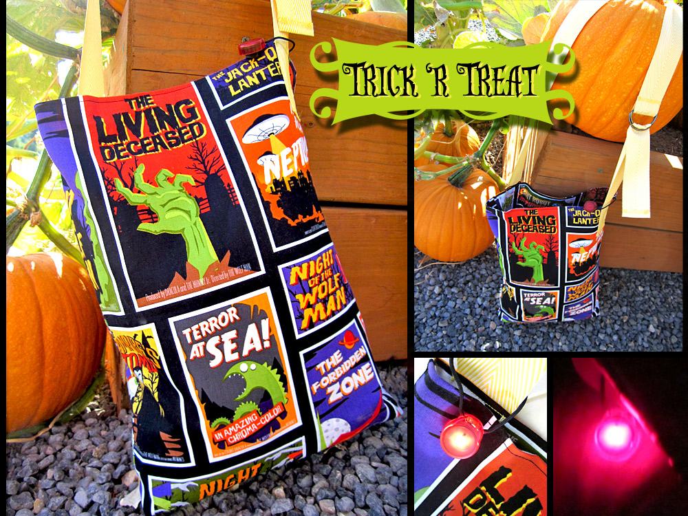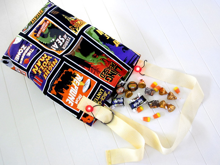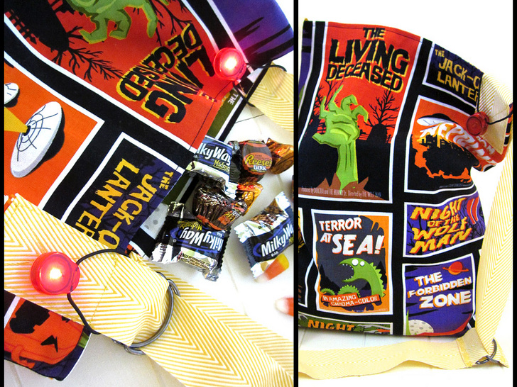 We designed a soft, unstructured trick-or-treat bag with a long, adjustable cross-body strap. We use the same fabric for both the exterior and the lining. A bright safety light is looped around each strap, to help make sure your lil’ spooks can be seen when they’re strolling in the… Twilight Zone.