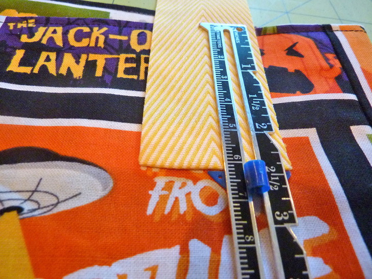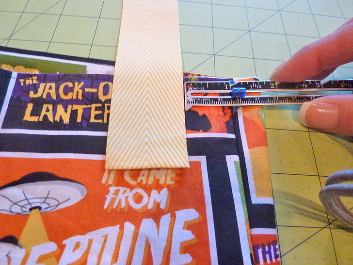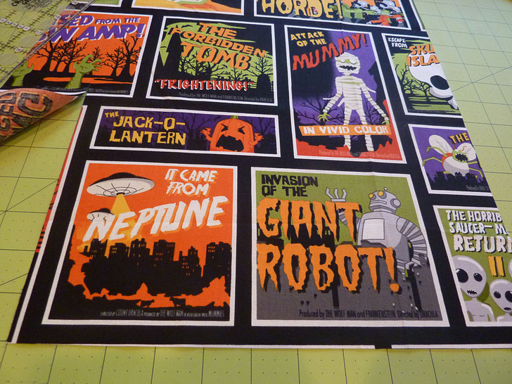 - From the spooky fabric, fussy cut FOUR 12″ wide x 15″ high rectangles, two for the exterior and two for the lining. We were very careful to center the scary posters for best visibility from both sides, remembering to account for our seam allowances.